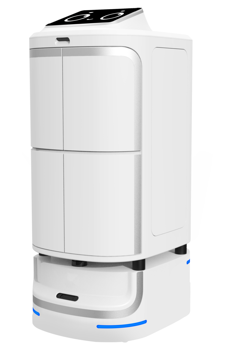 The UNIPRO 2 (Model: UNI P2) combines food delivery with customer greeting via a large advertising screen. It supports 40 kg loads on 4 trays, with dual RGB-D cameras and ultrasonic sensors for safe navigation up to 1.0 m/s. Up to 8 hours runtime makes it suitable for high-traffic restaurants and branded outlets.